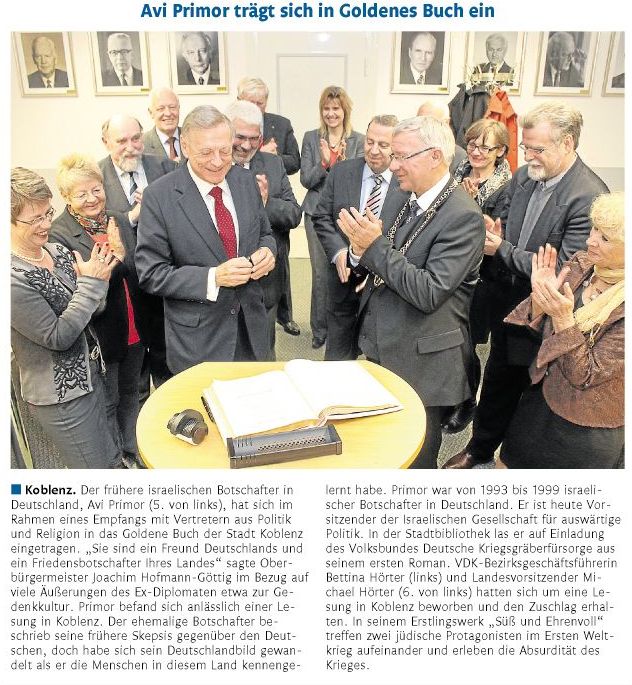 Avi Primor – Eintrag ins Goldene Buch der Stadt Koblenz: “Sie sind ein Freund Deutschlands und ein Friedensbotschafter Ihres Landes”, so OB Hofmann-Göttig