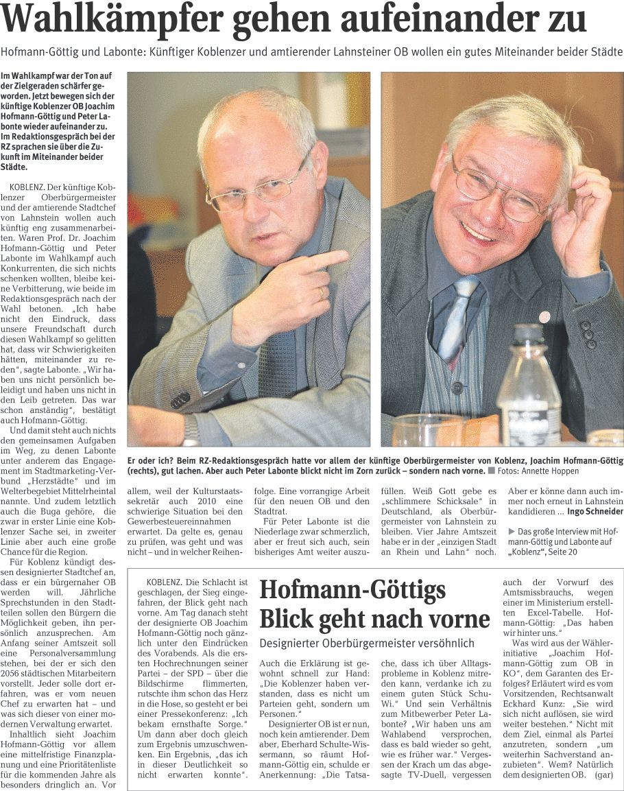 Mit 54,4 Prozent wurde Prof. Dr. Joachim Hofmann-Göttig zum neuen Koblenzer Oberbürgermeister gewählt. Sein Amt tritt er am 1. Mai 2010 an. In einer ersten Pressekonferenz mit dem Rechtsanwalt Eckard Kunz, Vorsitzender der Wählerinitiative, erklärte der designierte Oberbürgermeister: